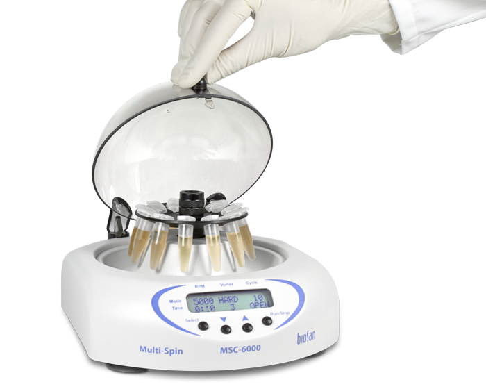 Центрифуга–вортекс MSC-6000 Мультиспин является продуктом многолетней эволюции «Спин–Микс–Спин» технологии, предназначенной для «сброса» микрообъемов реагентов на дно пробирки (первое центрифугирование–спин), последующего перемешивания (микс) и повторного сбора реагентов (повторный спин) со стенок и пробки микропробирок.