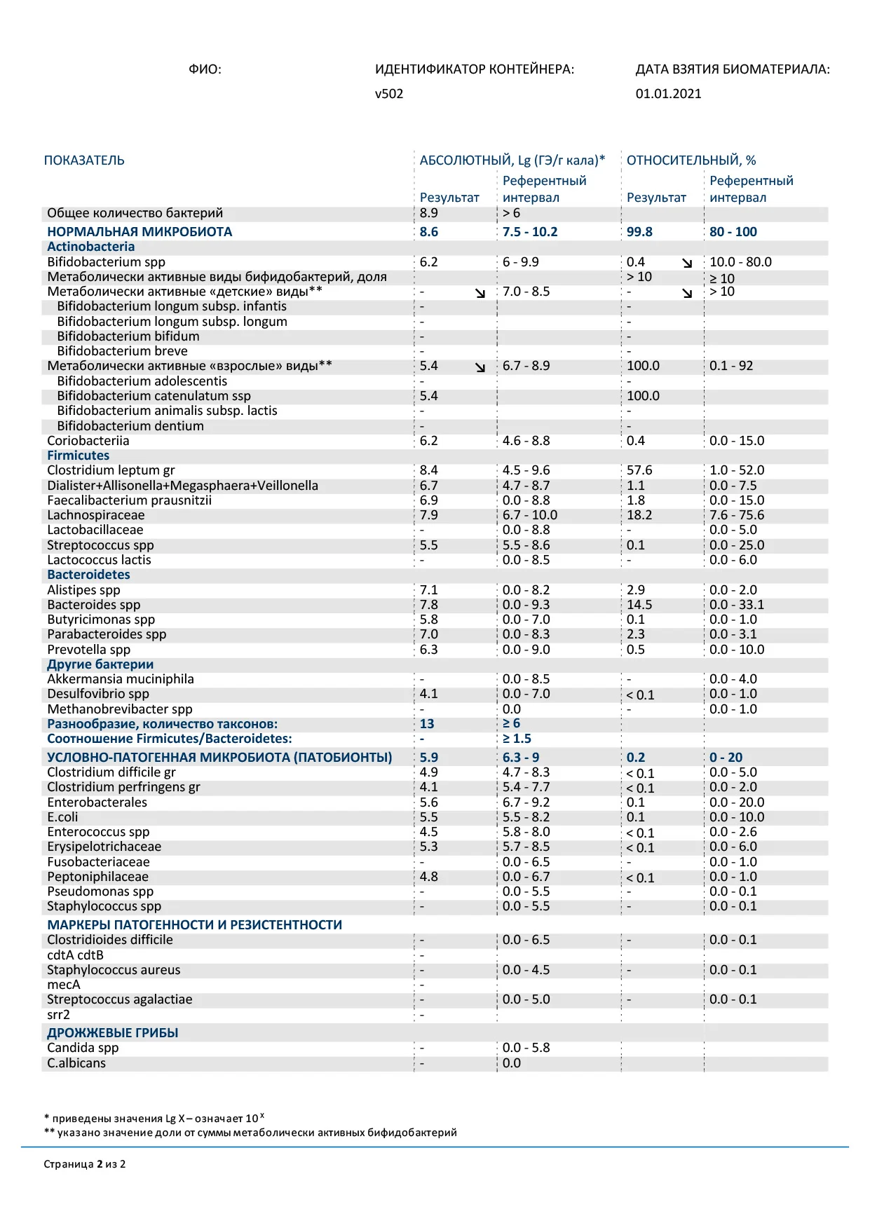 - количественная оценка представителей нормобиоты (филумы Actinomycetota (ранее Actinobacteria), Bacillota (ранее Firmicutes), Bacteroidota (ранее Bacteroidetes, Pseudomonadota (ранее Proteobacteria*), условно-патогенной микробиоты и грибов рода Candida