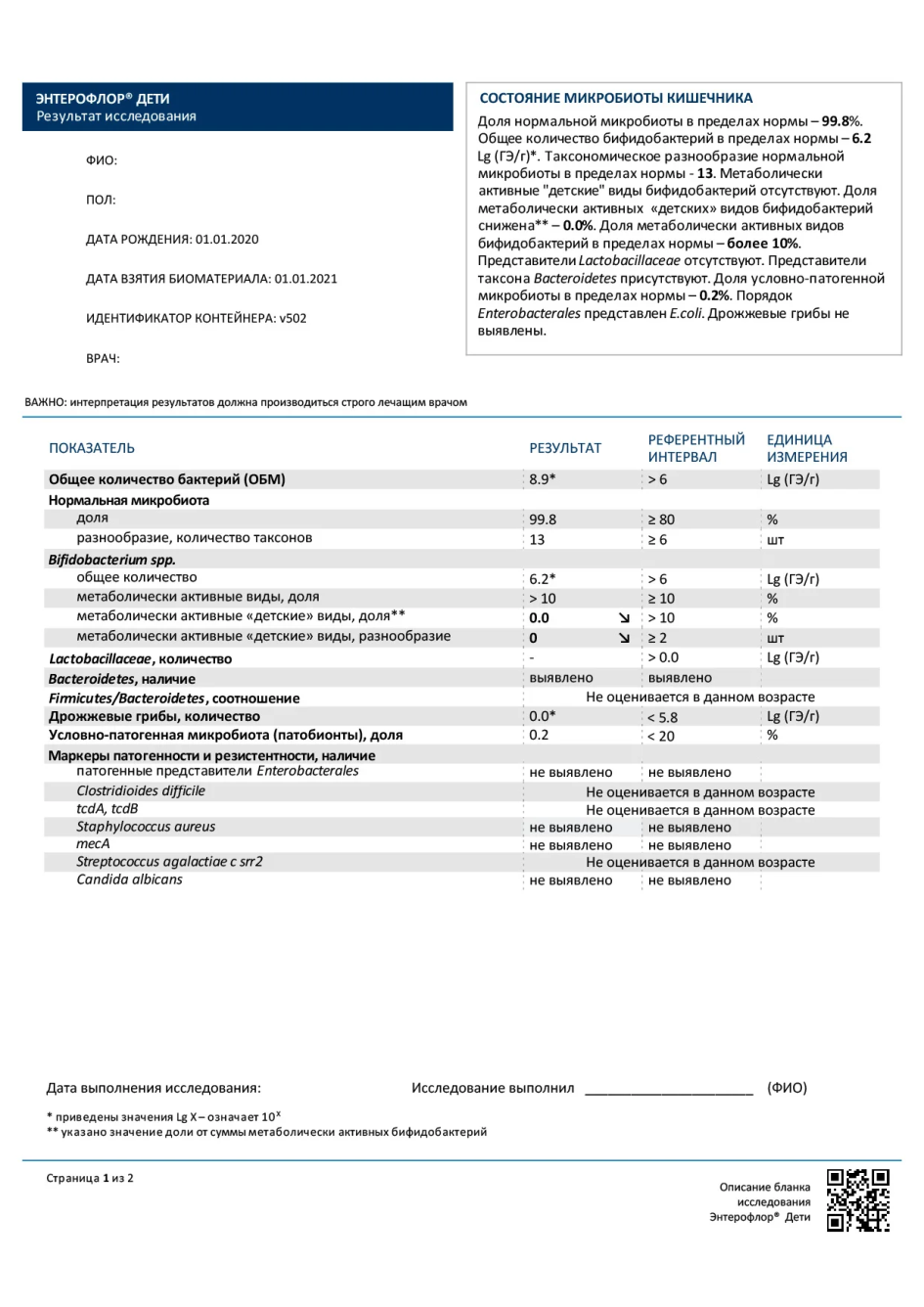 Бланк результатов исследования ЭНТЕРОФЛОР Дети